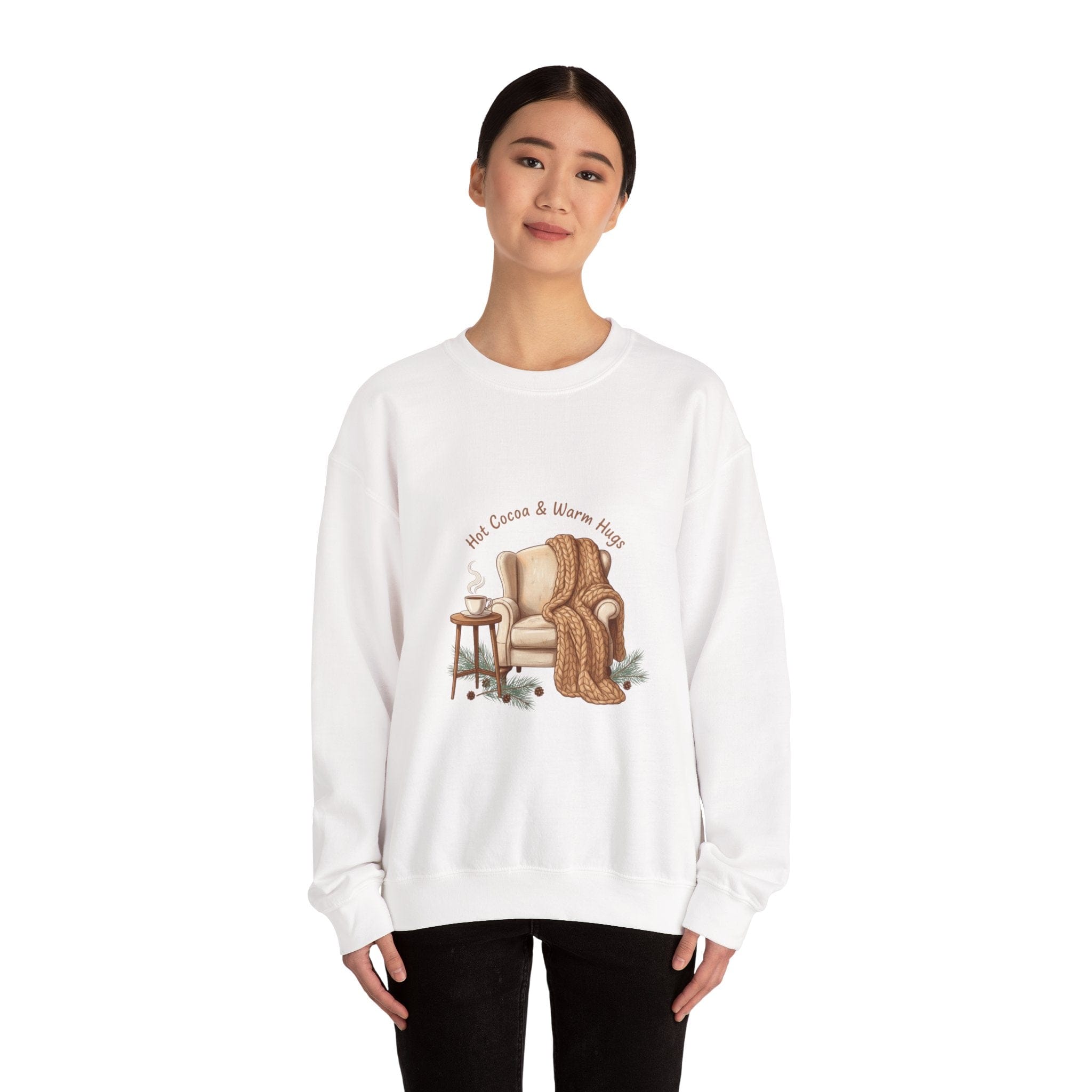 Soft, homebody-focused sweatshirt featuring a hand-illustrated armchair draped with a chunky knit blanket, a steaming mug on a side table, and delicate pine-sprig accents — styled in warm neutrals and gentle hand-lettered text that evoke hygge and cozycore downtime. The uncluttered composition and muted palette create a calming winter aesthetic that layers seamlessly into a restful at-home wardrobe for snuggle season and quiet evenings with a book or hot drink. Product features - Medium-heavy 8.0 oz/yd² (271 g/m²) 50/50 cotton-poly blend - Classic crewneck fit with double-needle stitching for durability - Embroidered decoration options at chest or wrists (design placement available) - Tubular knit construction (no side seams) with ribbed knit collar - OEKO-TEX dyes; made in Nicaragua; meets stated safety compliance standards Care instructions - Machine wash: cold (max 30C or 90F) - Non-chlorine: bleach as needed - Tumble dry: low heat - Do not iron - Do not dryclean