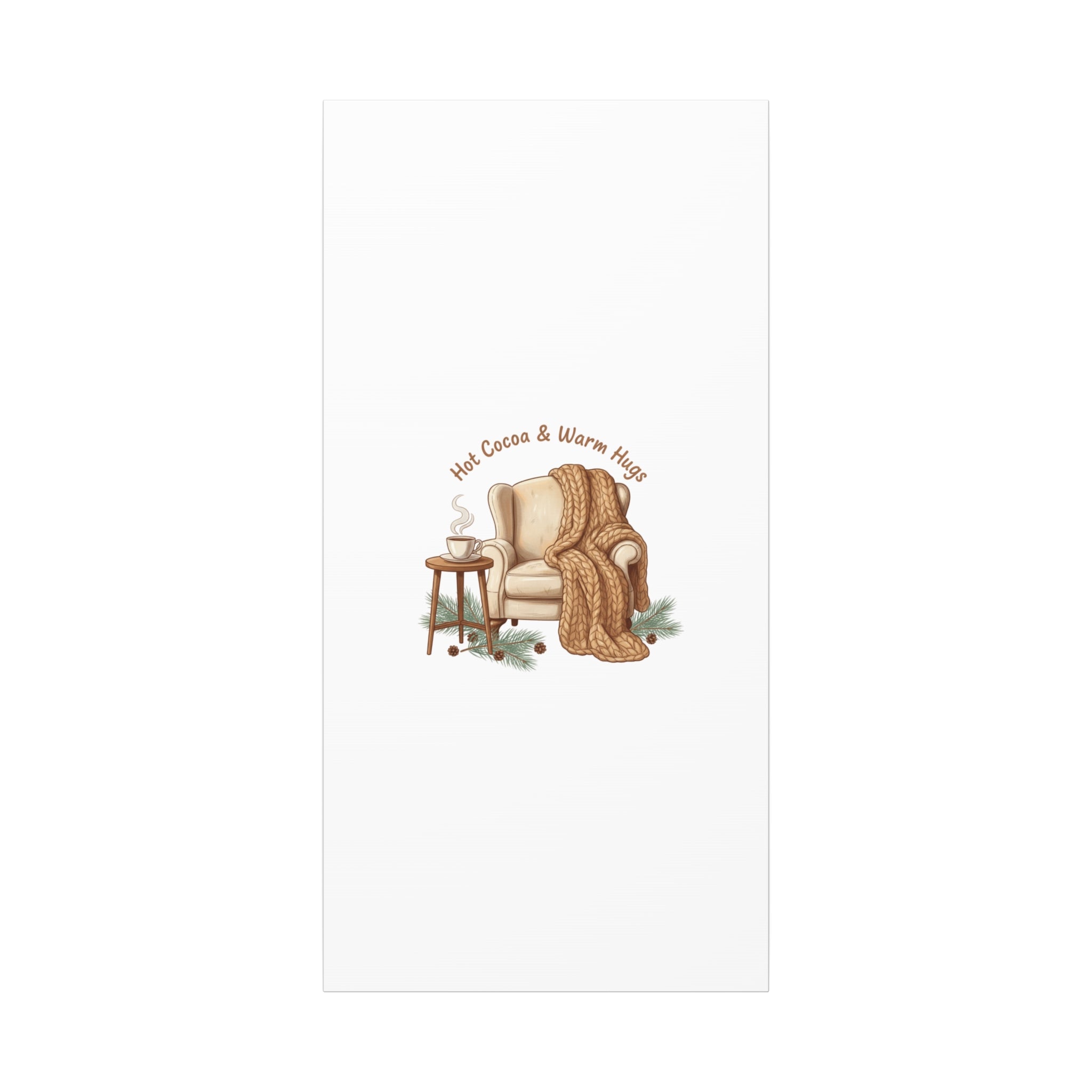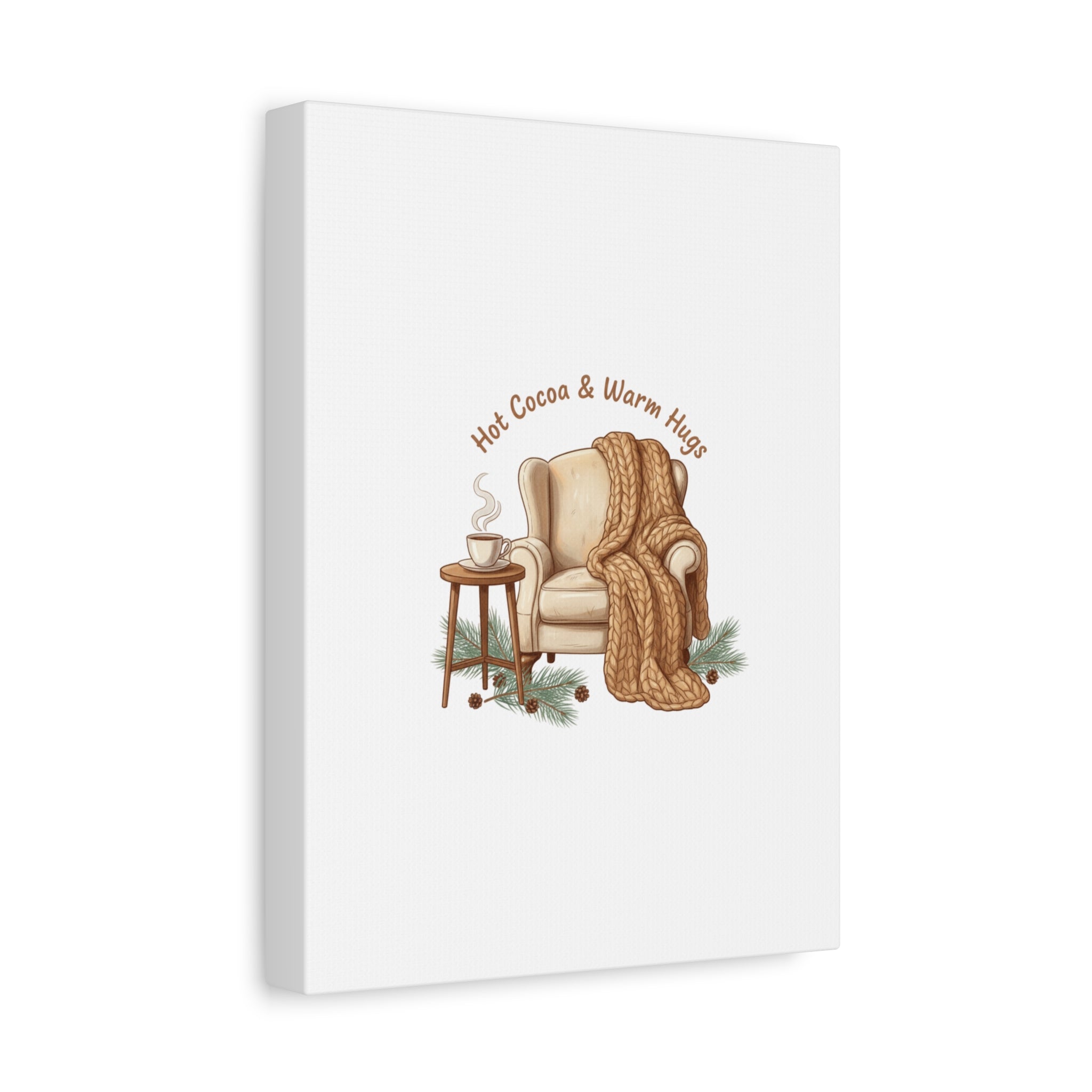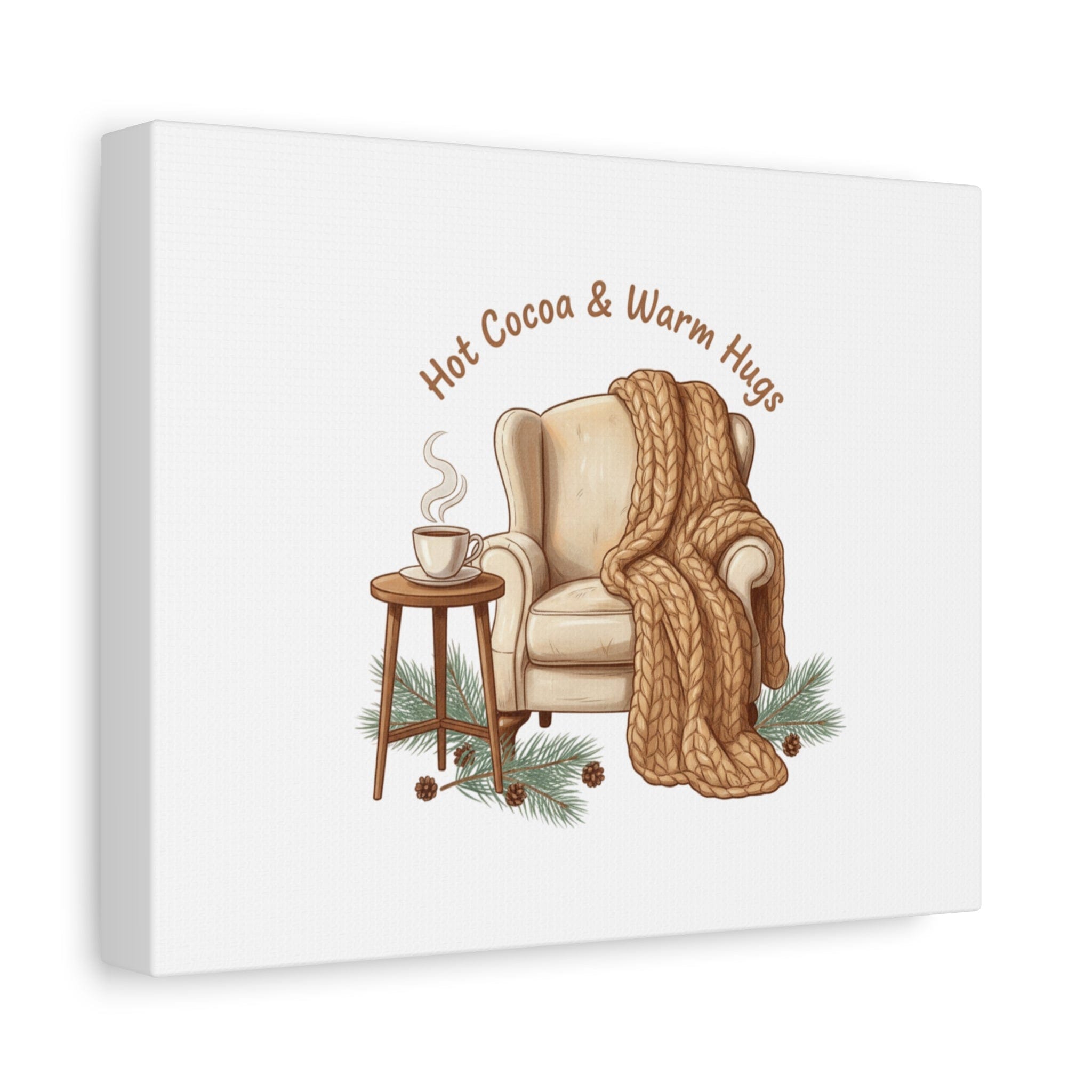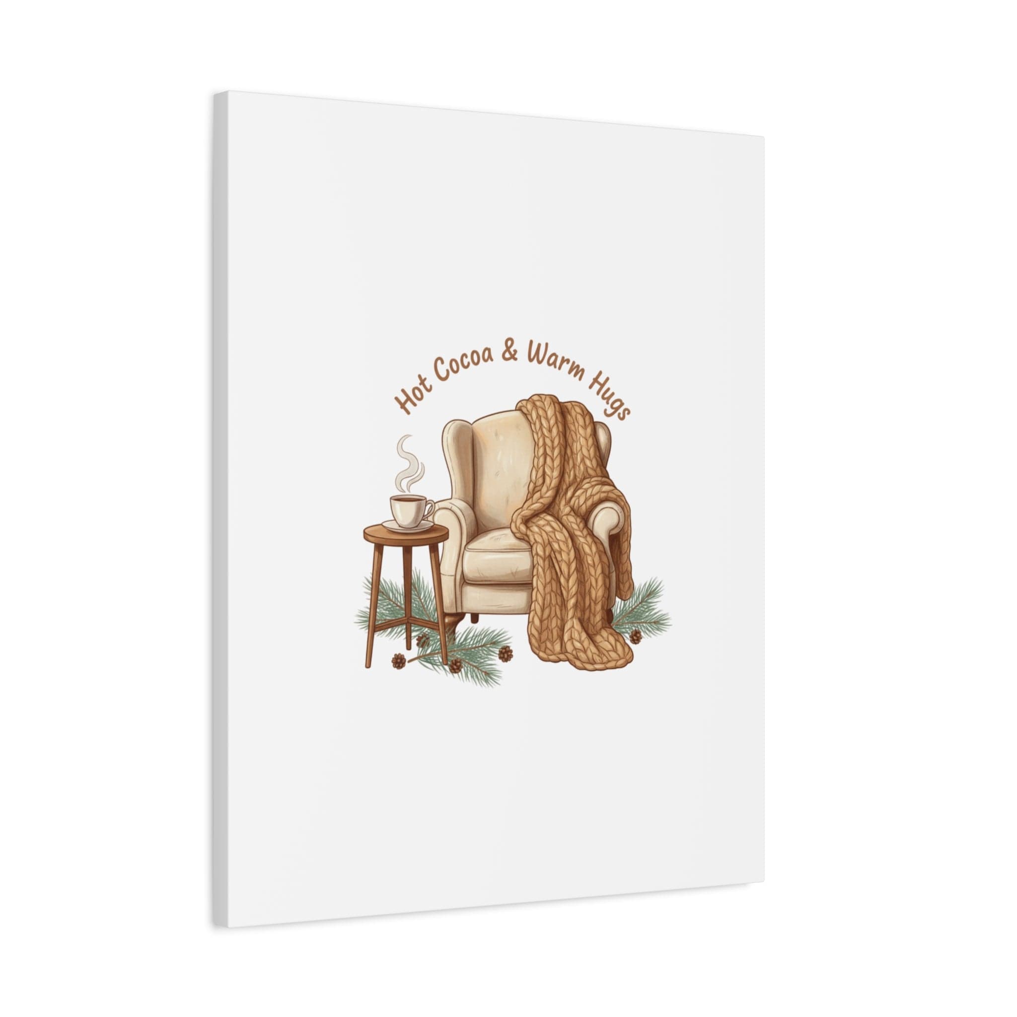Cozy armchair scene printed on matte stretched canvas, capturing hygge and cottagecore winter vibes with warm neutrals and hand-lettered text. The illustration shows a plush armchair draped in a chunky knit blanket beside a small table holding a steaming mug, plus pine sprigs and chestnuts—a serene, homebody image that fits snuggle-season decor and quiet winter routines. The clean composition and soft palette pair naturally with cozycore and hygge styling, adding calm, nostalgic warmth to living rooms, reading nooks, or entryways. Product features - Matte canvas, cotton/polyester composite - Stretched on pine inner frame from FSC-certified renewable forests - Printed with UL-certified Greenguard Gold latex inks - Back hanging included; soft rubber dots on bottom back corners - Available in 60 sizes and horizontal, vertical, or square orientations Care instructions - If the canvas does gather any dust, you may wipe it off gently with a clean, damp cloth.