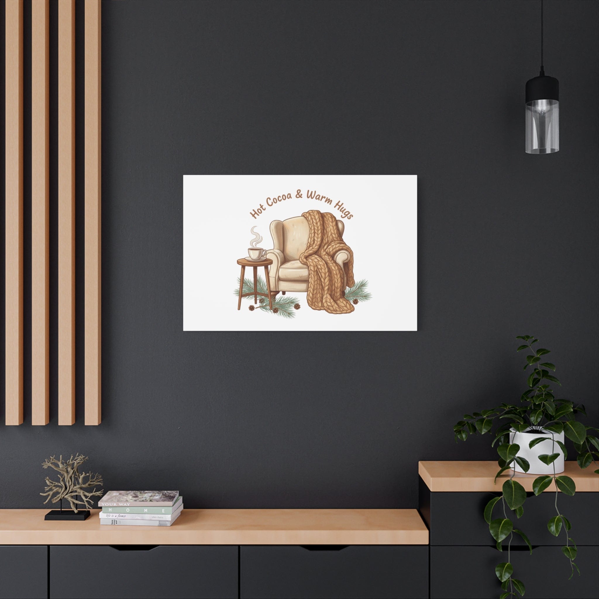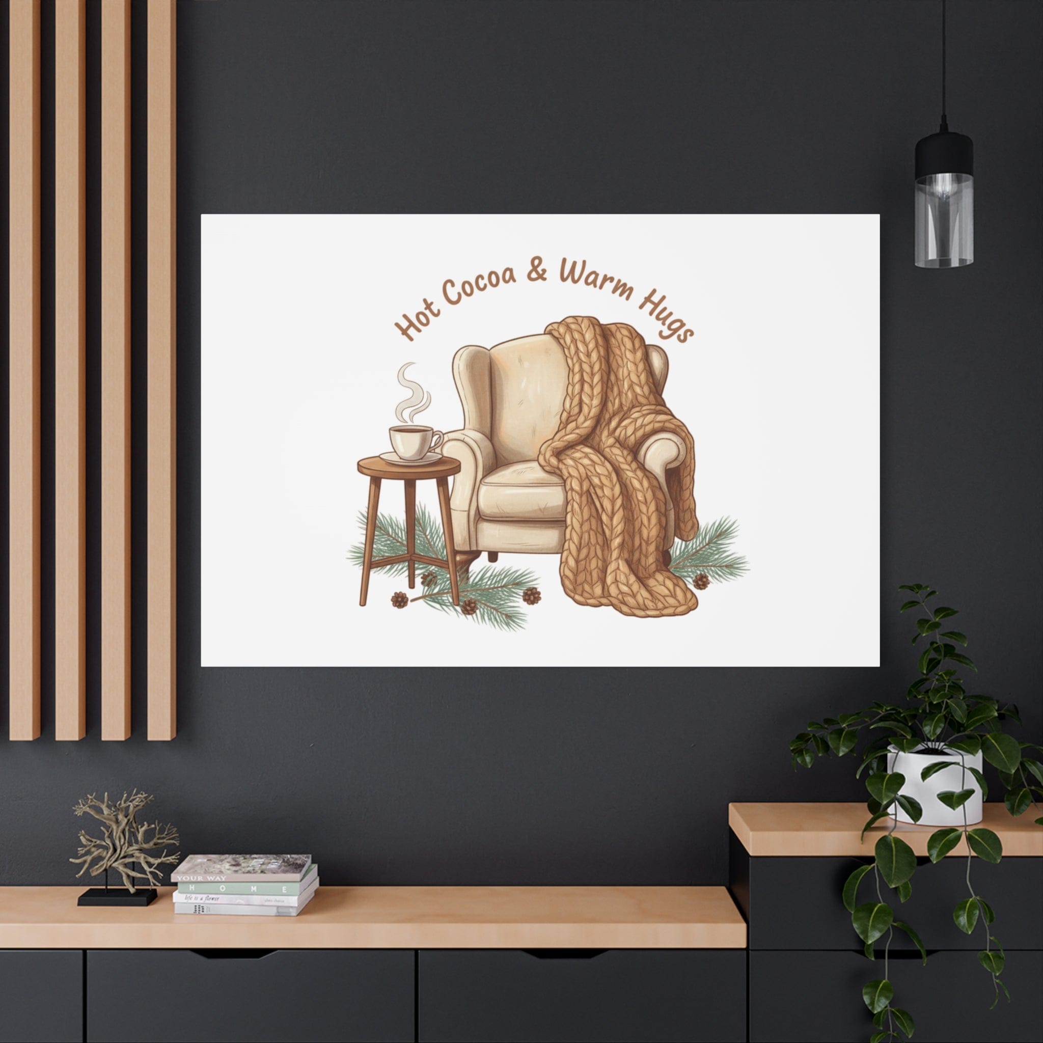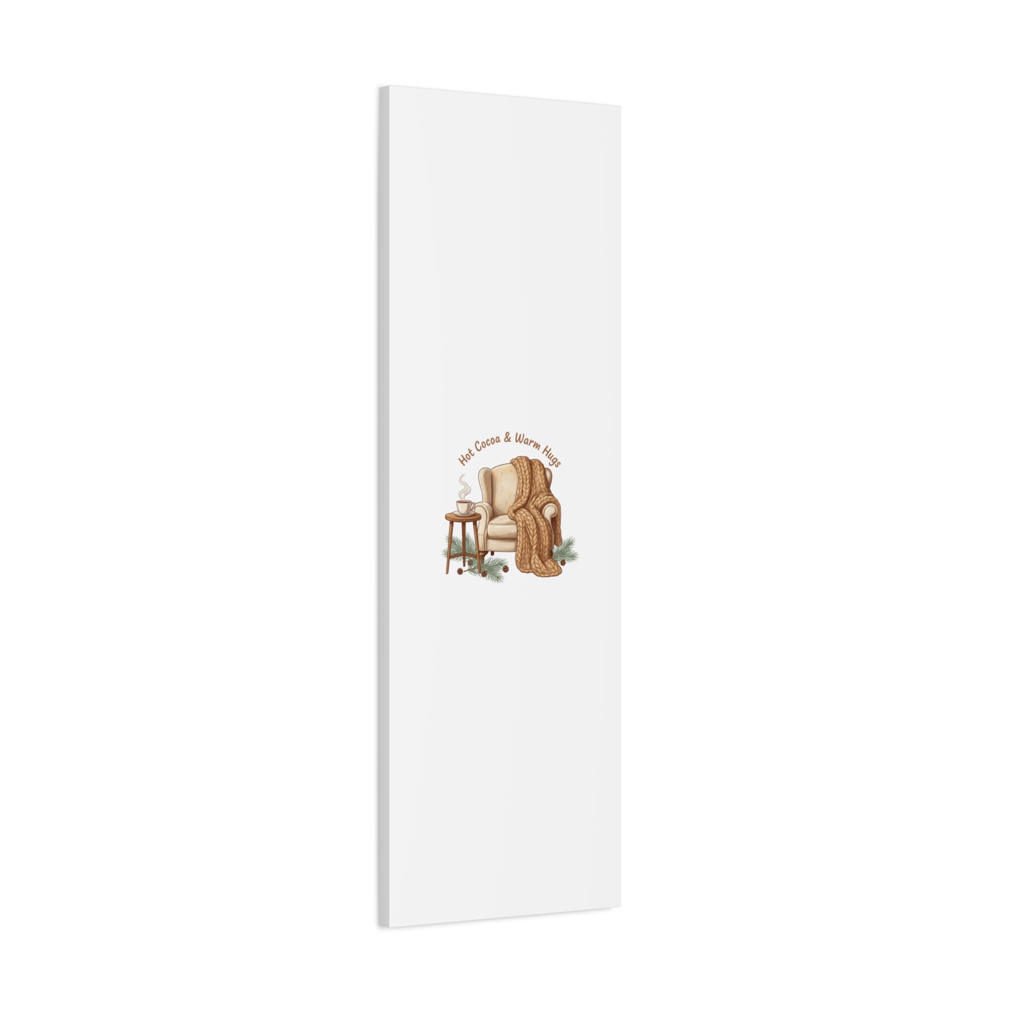 Cozy armchair scene printed on matte stretched canvas, capturing hygge and cottagecore winter vibes with warm neutrals and hand-lettered text. The illustration shows a plush armchair draped in a chunky knit blanket beside a small table holding a steaming mug, plus pine sprigs and chestnuts—a serene, homebody image that fits snuggle-season decor and quiet winter routines. The clean composition and soft palette pair naturally with cozycore and hygge styling, adding calm, nostalgic warmth to living rooms, reading nooks, or entryways. Product features - Matte canvas, cotton/polyester composite - Stretched on pine inner frame from FSC-certified renewable forests - Printed with UL-certified Greenguard Gold latex inks - Back hanging included; soft rubber dots on bottom back corners - Available in 60 sizes and horizontal, vertical, or square orientations Care instructions - If the canvas does gather any dust, you may wipe it off gently with a clean, damp cloth.