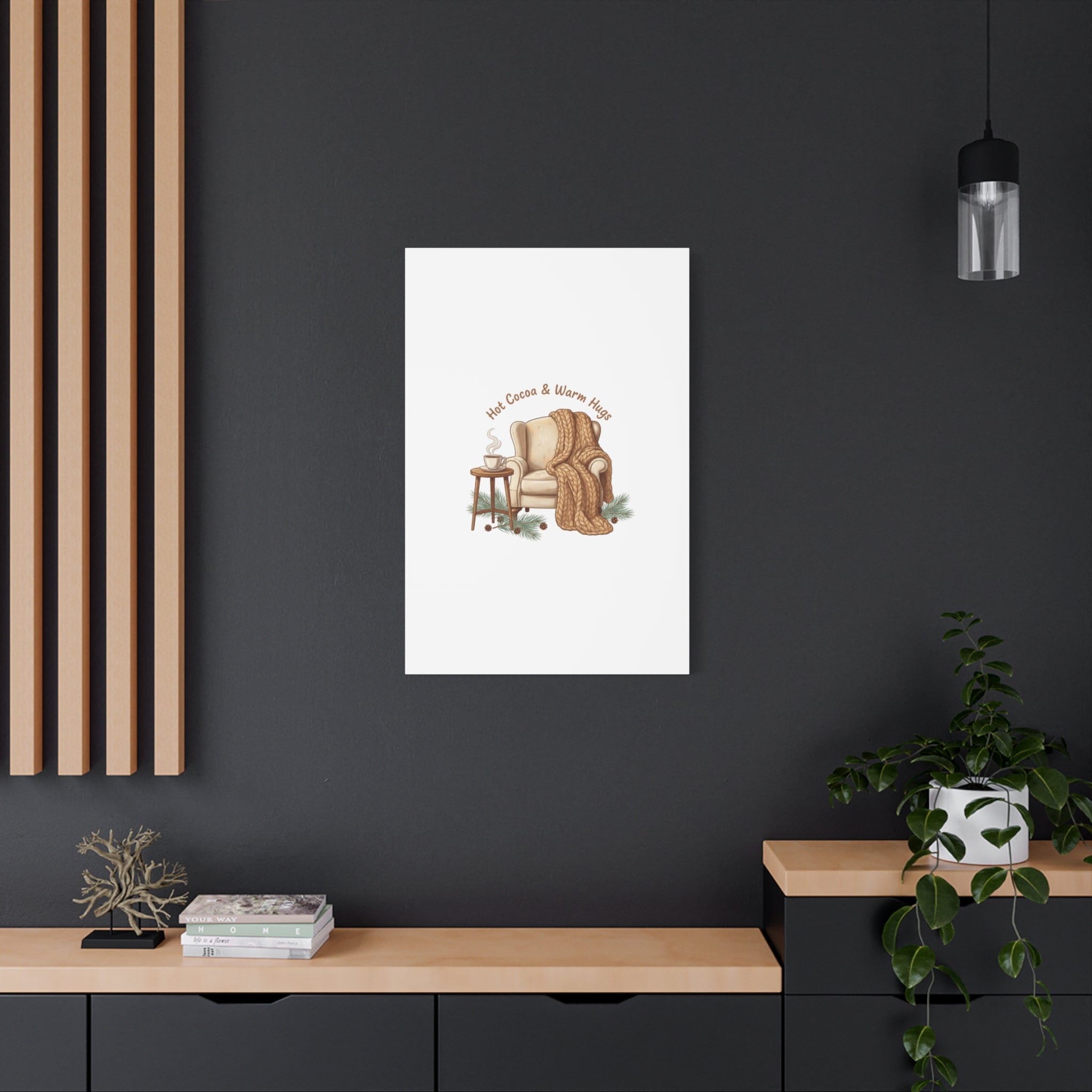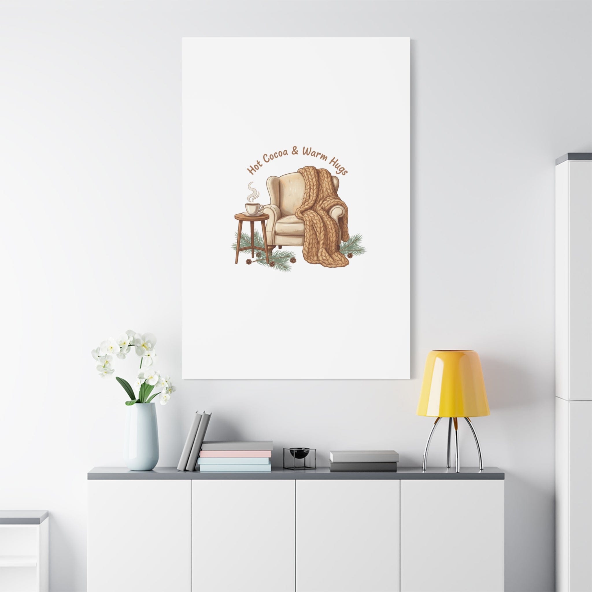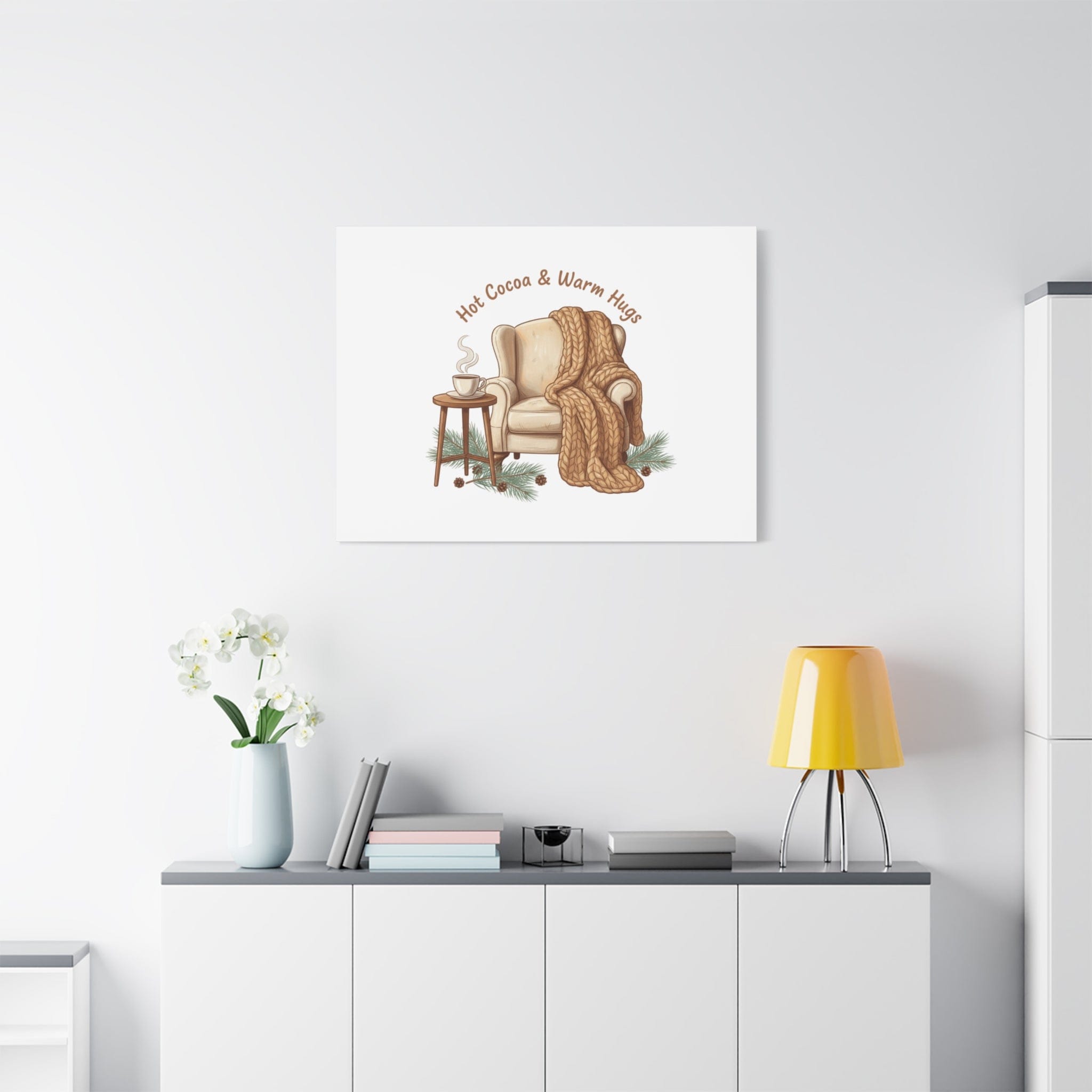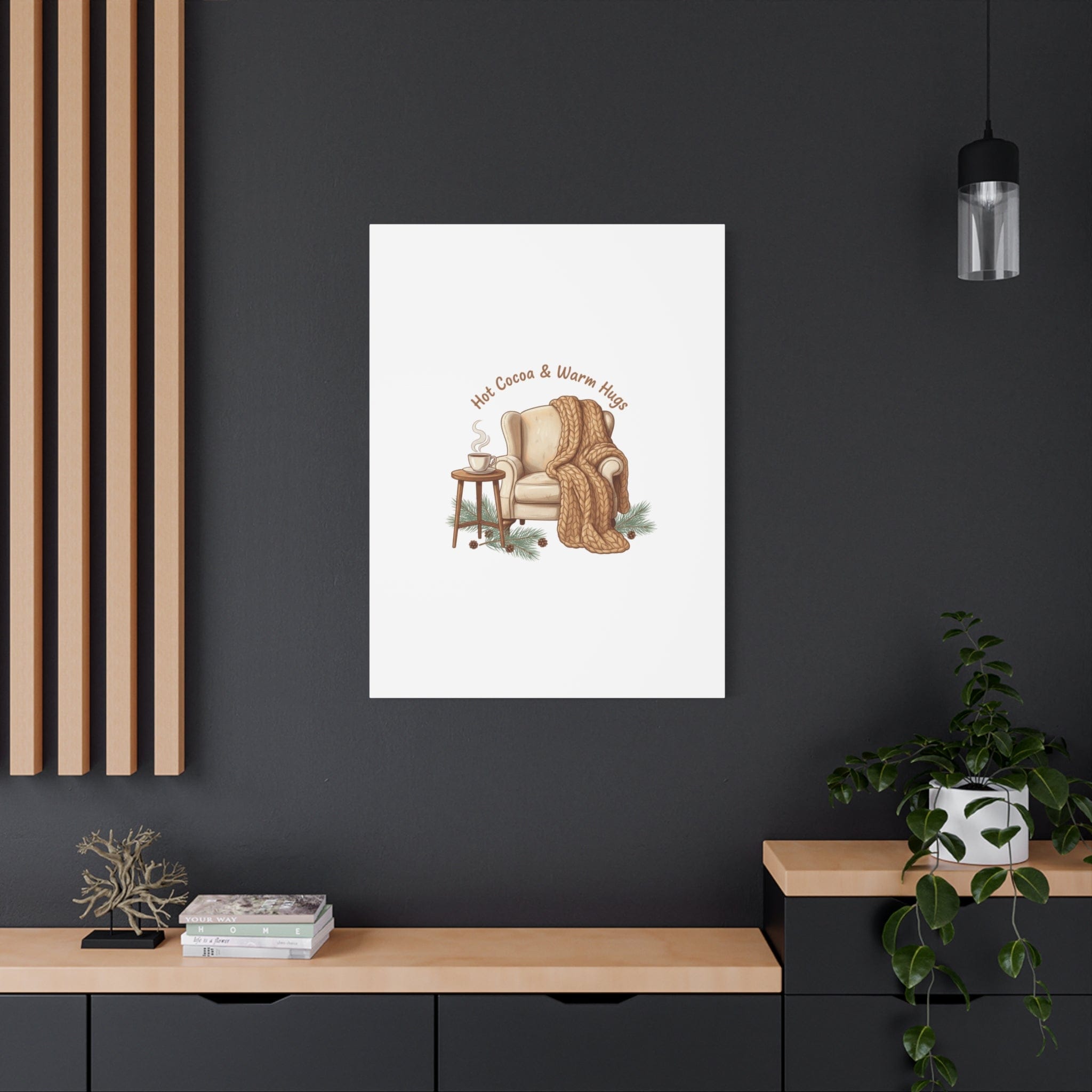 Cozy armchair scene printed on matte stretched canvas, capturing hygge and cottagecore winter vibes with warm neutrals and hand-lettered text. The illustration shows a plush armchair draped in a chunky knit blanket beside a small table holding a steaming mug, plus pine sprigs and chestnuts—a serene, homebody image that fits snuggle-season decor and quiet winter routines. The clean composition and soft palette pair naturally with cozycore and hygge styling, adding calm, nostalgic warmth to living rooms, reading nooks, or entryways. Product features - Matte canvas, cotton/polyester composite - Stretched on pine inner frame from FSC-certified renewable forests - Printed with UL-certified Greenguard Gold latex inks - Back hanging included; soft rubber dots on bottom back corners - Available in 60 sizes and horizontal, vertical, or square orientations Care instructions - If the canvas does gather any dust, you may wipe it off gently with a clean, damp cloth.